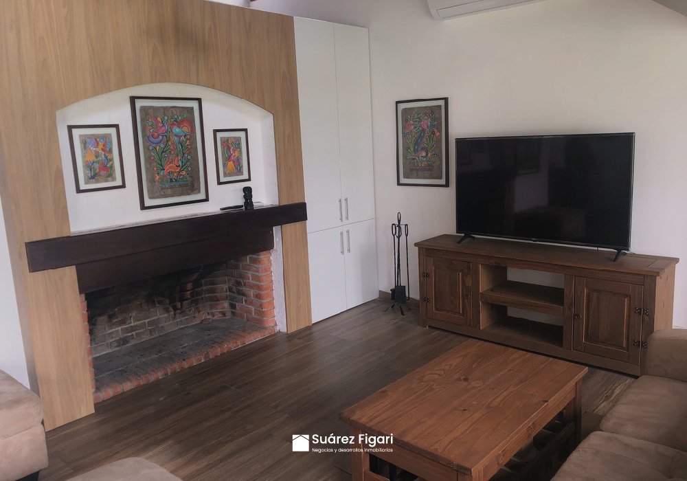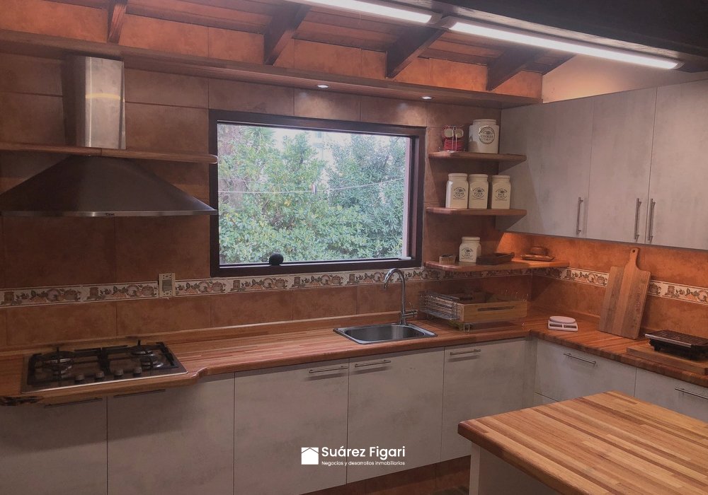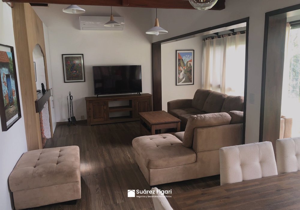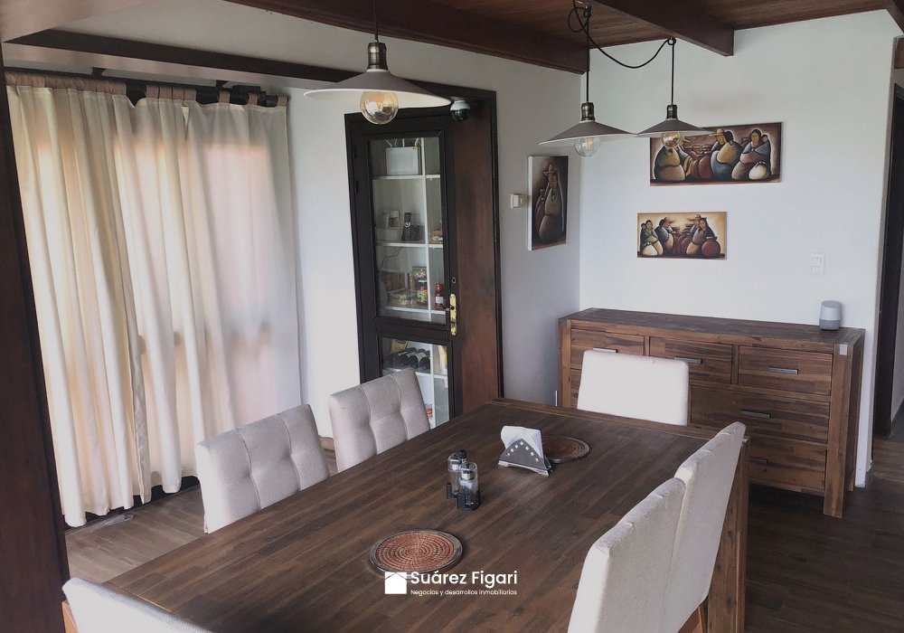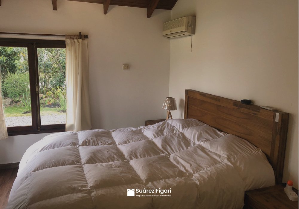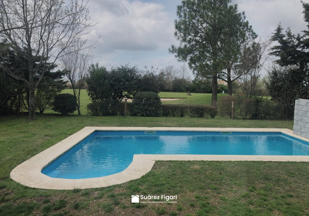 La propiedad cuenta con living-comedor con estufa a leña, cocina comedor diario, baño social, 4 dormitorios, 2 baños, salón de juego, barbacoa, piscina y lindo parque junto a la Cancha de Golf.